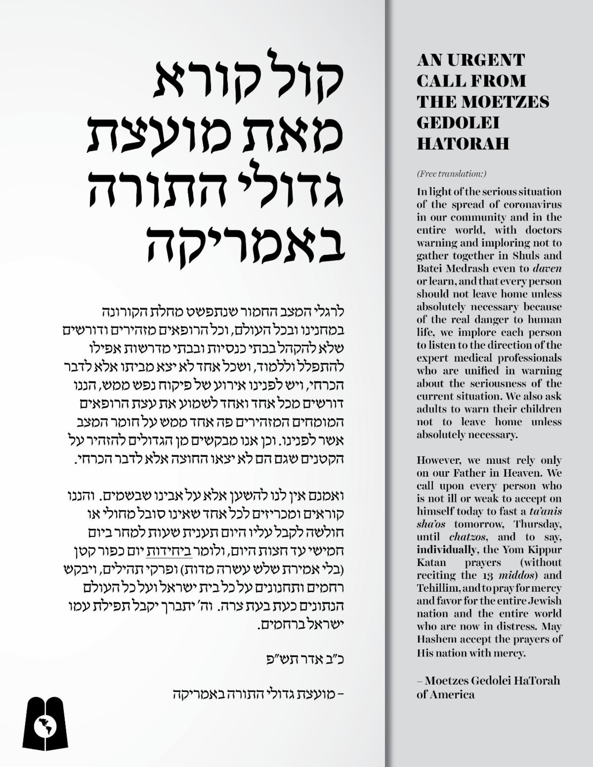 Subject: Coronavirus - Urgent Proclamation from Moetzes Gedolei HaTorah