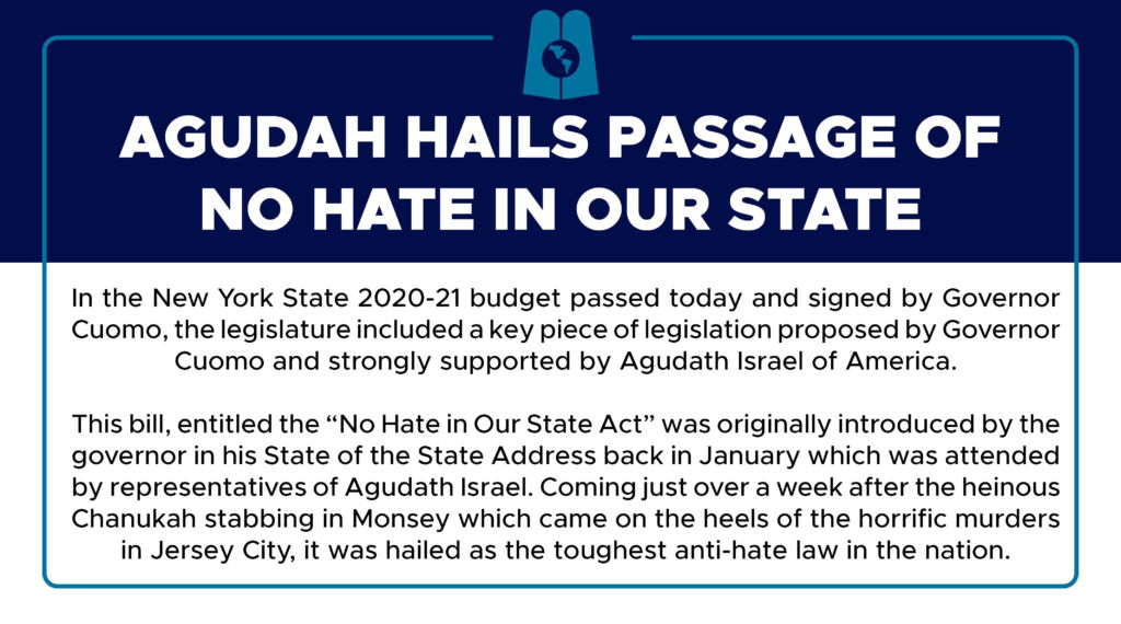 In the New York State 2020-21 budget passed today and signed by Governor Andrew Cuomo, the legislature included a key piece of legislation proposed by Governor Cuomo and strongly supported by Agudath Israel of America.