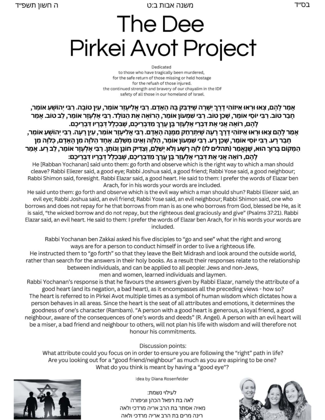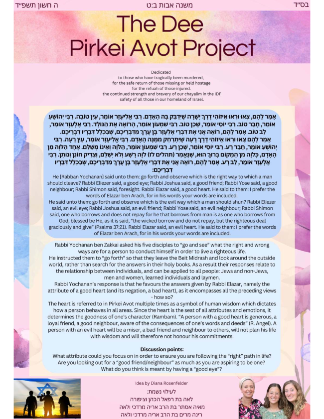 | We are now dedicating each Mishna of Pirkei Avot to all those in need of Tefillot in Eretz Yisrael as well as leilui nishmat Lucy, Maia and Rina Dee. The final two pages contain a list of names of soldiers in need of protection, names of those missing or held hostage and those injured submitted by those in our TDPAP community. It is also leilui nishmat for those tragically killed, as listed. May our learning of Mishna 2:9 storm the heavens and serve as a tremendous zechut to Am Yisrael. ❤