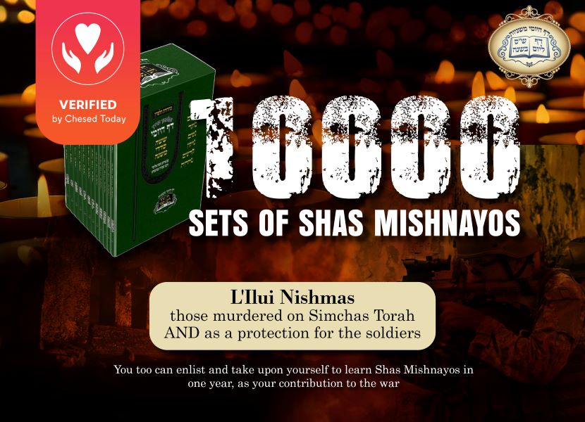 We are printing 10,000 sets of Shas Mishnayos for 10,000 avreichim in Eretz Yisroel, who are taking upon themselves to finish the entire Mishnayos in one year, l'ilui nishmas those who were killed in the Simchas Torah massacre, and as a powerful shmira for klal yisroel.