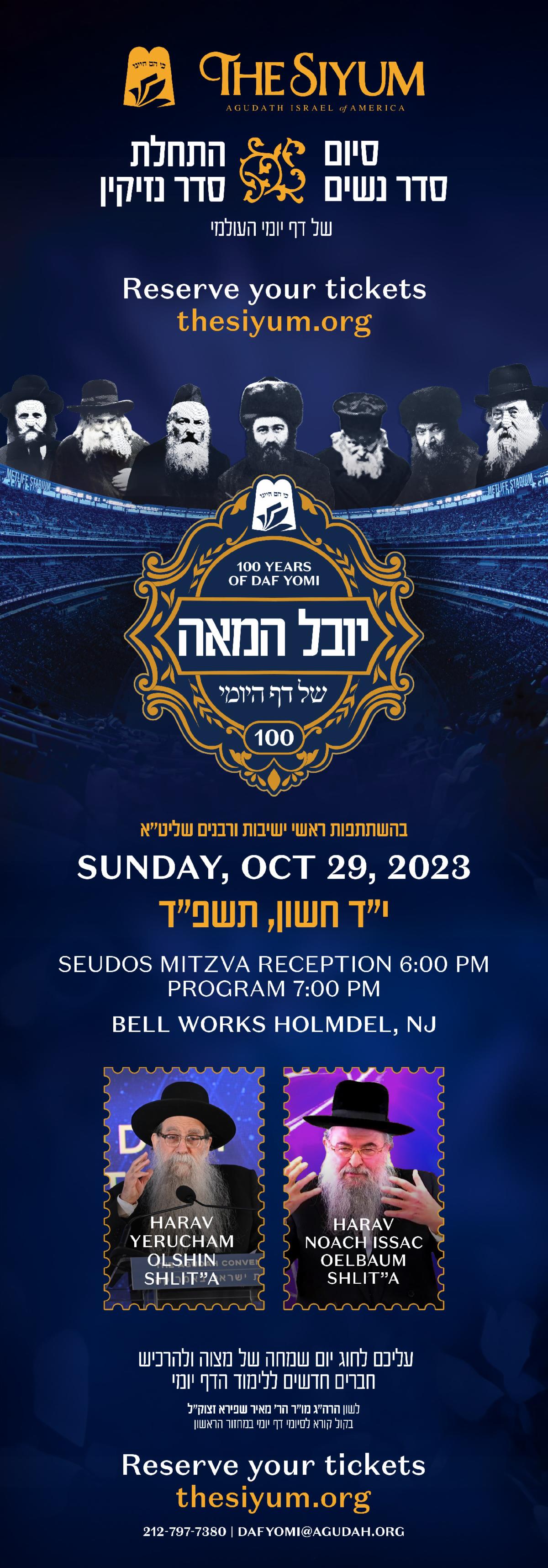 We invite you and your family for a siyum on Seder Nashim, marking the half-way point of the 14th cycle of Daf Yomi, on Sunday, October 29th, 2023 at Bell Works. The Siyum is sure to be an uplifting display of Kovod Shamayim that will inspire continued growth. This event will be graced by leading Roshei Yehiva and Rabbanim.