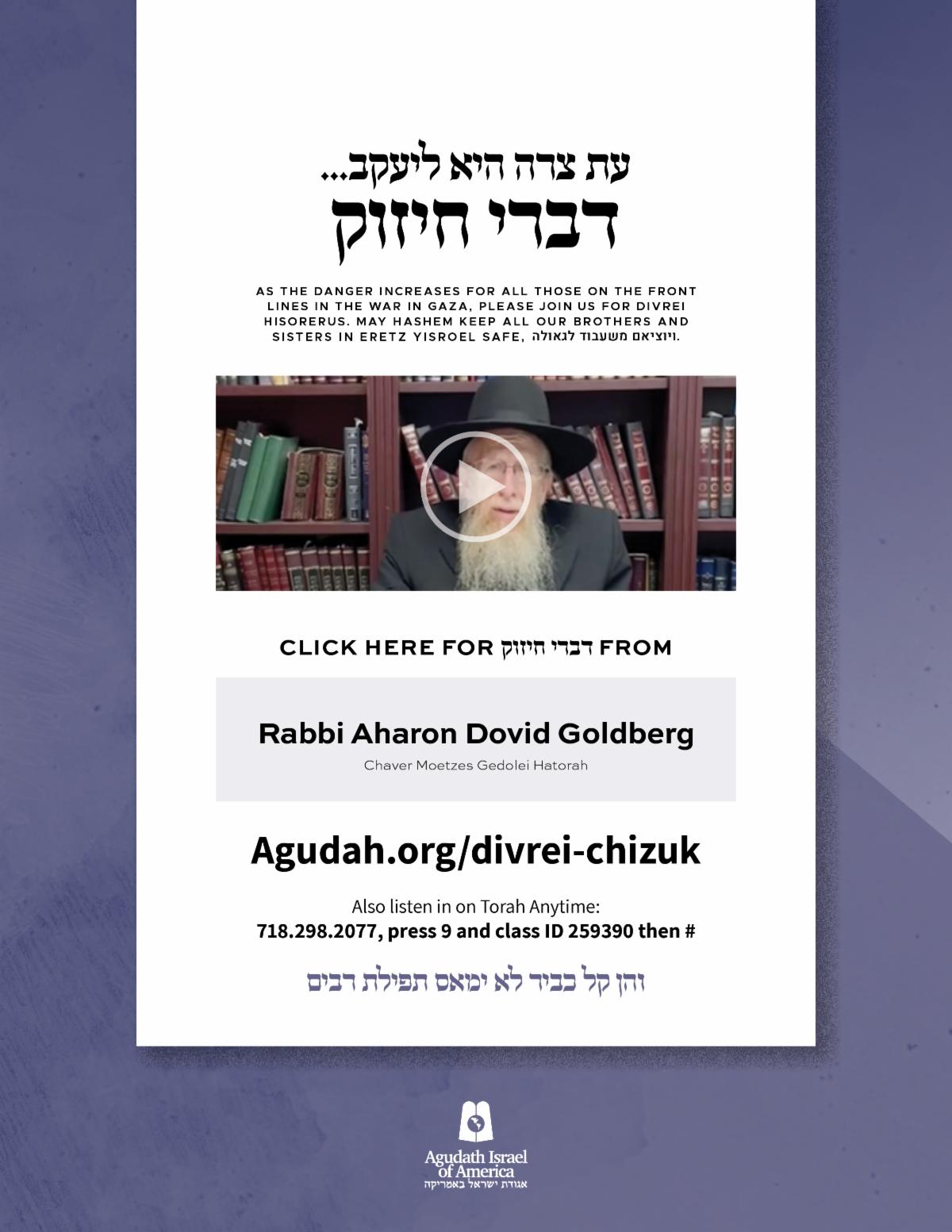 For divrei chizuk from Chaver Moetzes Gedolei HaTorah Rabbi Aharon Dovid Goldberg, click here or listen in on Torah Anytime: 718.298.2077, press 9 and class ID 259390 then #.