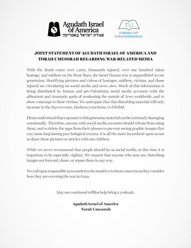 Joint Statement of Agudath Israel of America and Torah Umesorah Regarding War-related Media