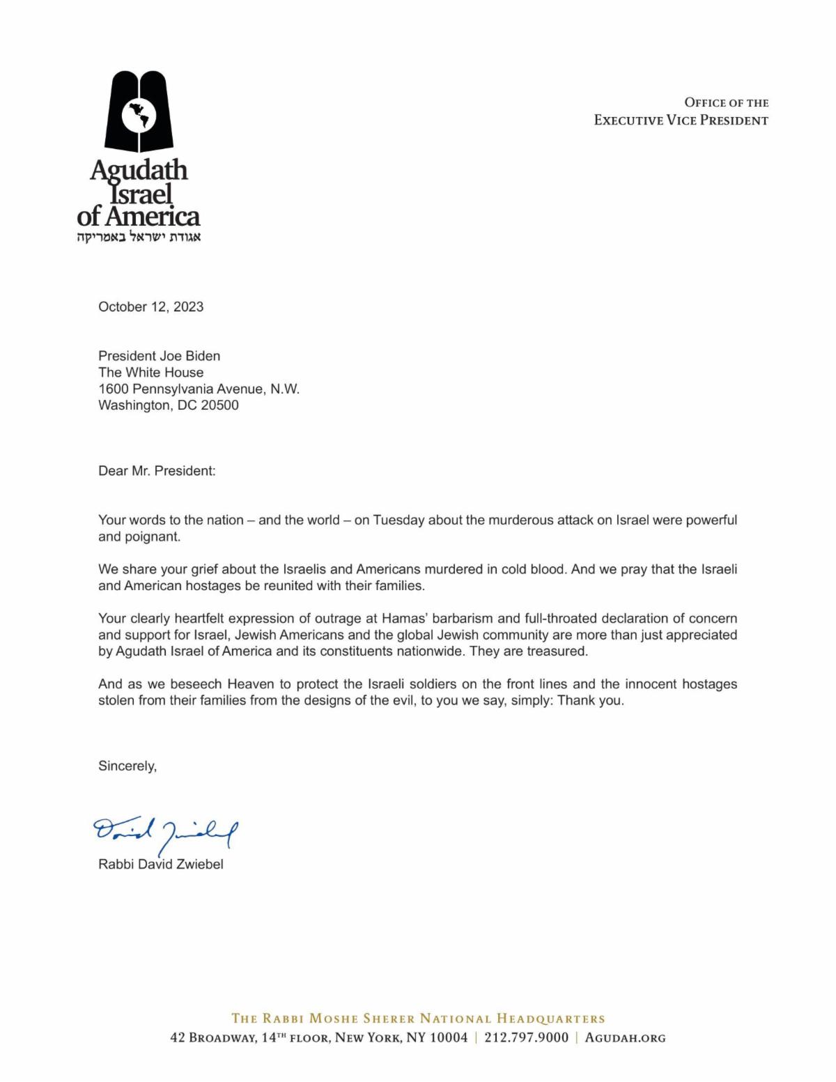 Your clearly heartfelt expression of outrage at Hamas' barbarism and full-throated declaration of concern and support for Israel, Jewish Americans and the global Jewish community are more than just appreciated by Agudath Israel of America and its constituents nationwide. They are treasured.