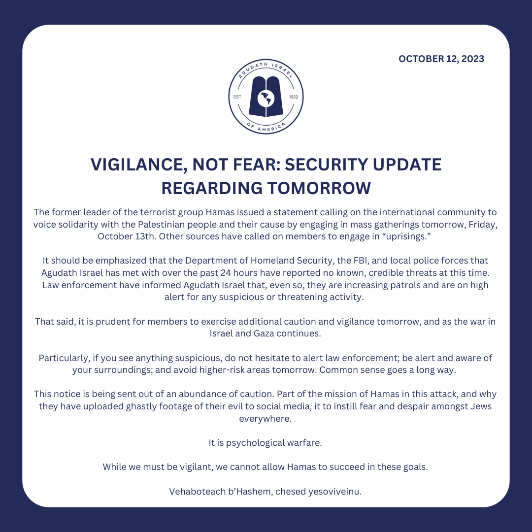 This notice is being sent out of an abundance of caution. Part of the mission of Hamas in this attack, and why they have uploaded ghastly footage of their evil to social media, it to instill fear and despair amongst Jews everywhere.