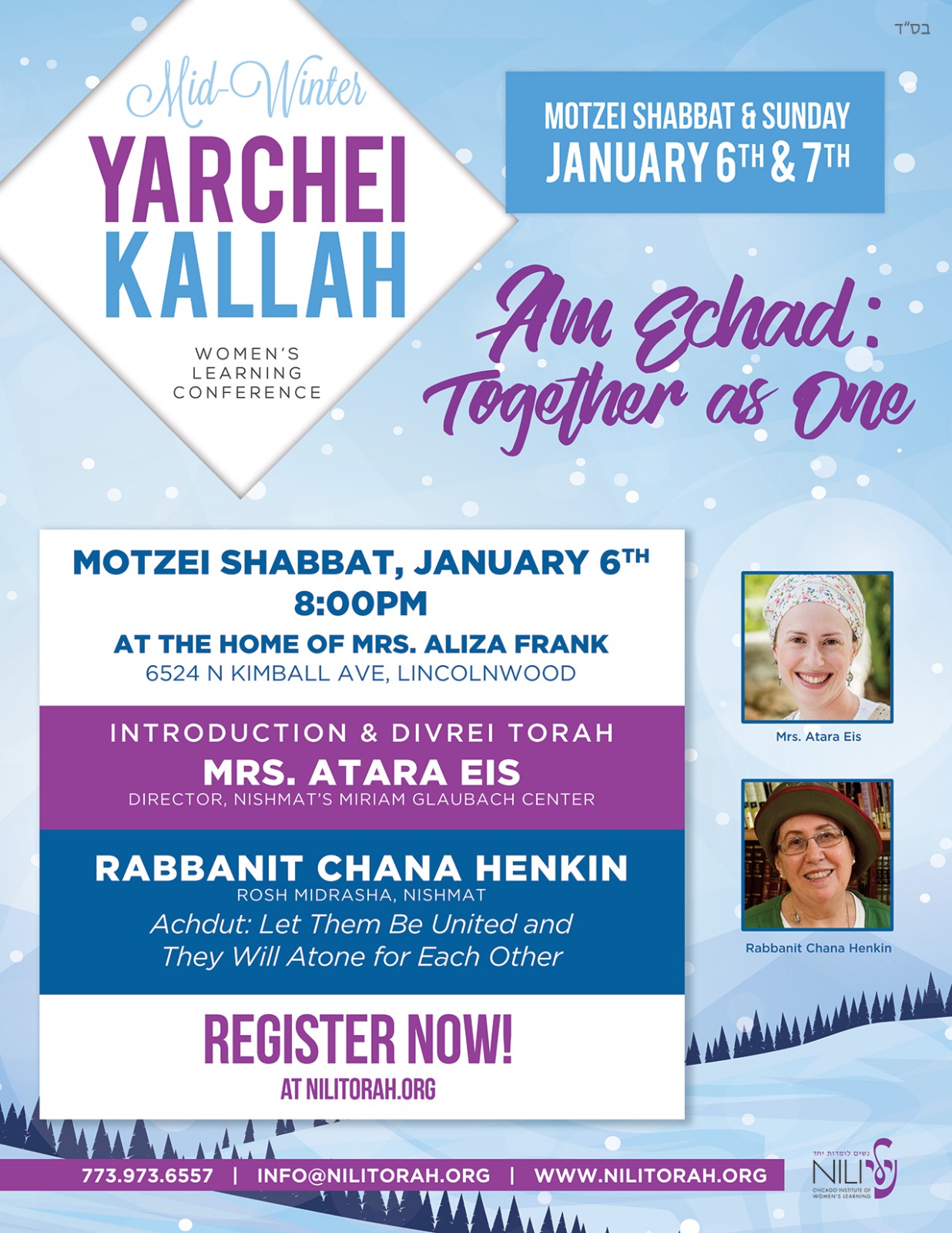 ----- Forwarded Message -----From: "NILI: Chicago Institute of Women's Learning" <info@nilitorah.org>To: "Chana Chroman" <mates57564@aol.com>Sent: Thu, Jan 4, 2024 at 5:02 PMSubject: Shabbat with Nishmat and Mid-Winter Yarckei Kallah Speakers