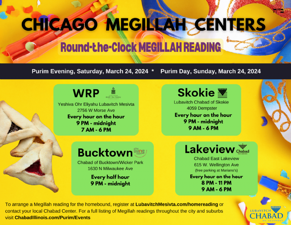 - For a full listing of Megillah readings through the city and suburbs visit ChabadIllinois.com/Purim/Events .