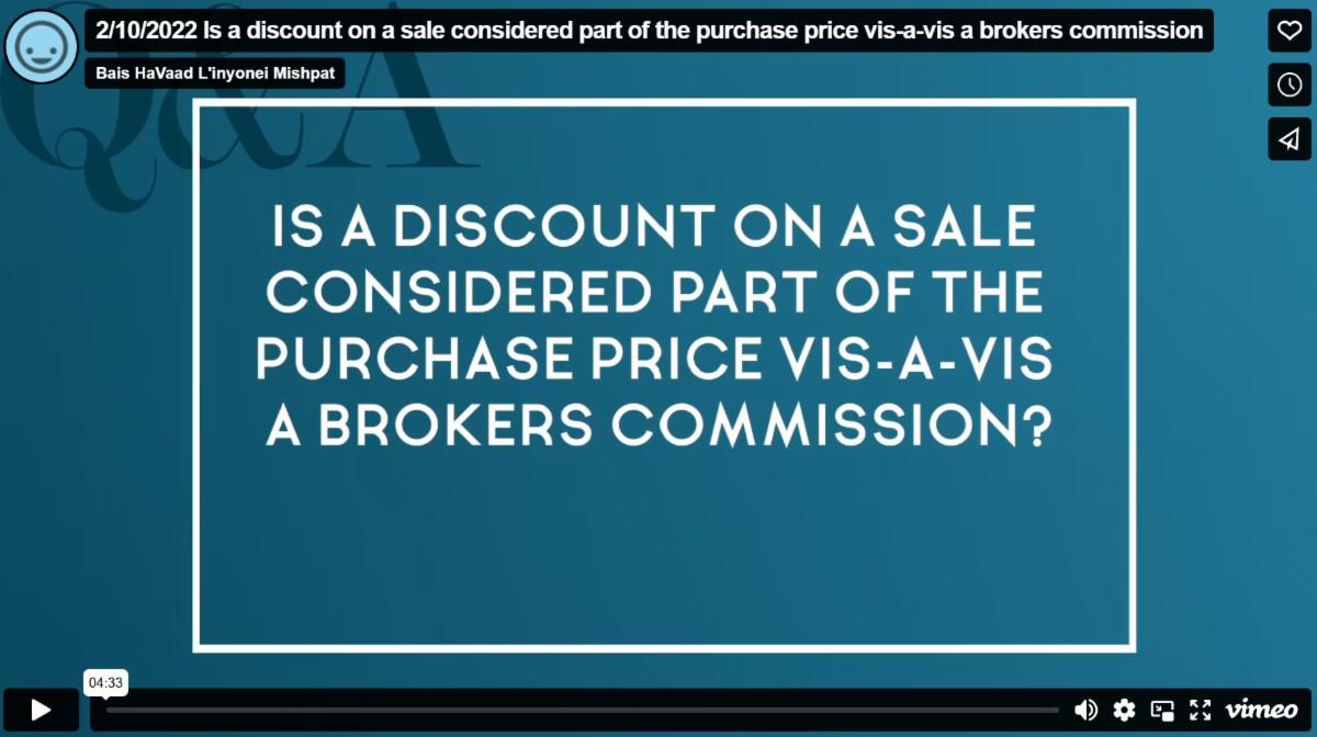 If, however, this buyer was only willing to pay $990,000, but he agreed to the deal wherein he would accept $10,000 less in rent in exchange for this price, the halacha would be different. If that were the case, we would have to determine if the rent the seller is paying is a reasonable market value or not. If the amount he ends up paying is somewhat reasonable, even if it is on the lower end, it would be considered a normal rental of the property, and the purchase price of $990,000 would be considered the actual price – which would mean that the broker would receive 15% of that amount as his commission. If, however, the amount the seller is paying in rent is now well below market value, it cannot be considered to be the actual rental amount, as no one would rent this property for so little. It is, therefore, obvious that the reduction in rent is part of the purchase price. This means that the actual purchase price is higher than what was paid, and the broker deserves a commission based on the actual purchase price, which in this case would be $1 million. |