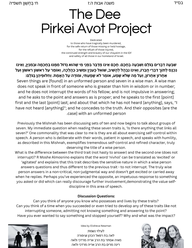 | This week's idea on Mishna 5:7 is written by Elisheva Newman. Elisheva, born and educated in London UK, has been dedicated to Jewish education, both formal and informal, for the past 15 years. Currently an educator for Aish UK and previously Aish on Campus in Bristol. One student at Bristol was particularly close to the Dee girls and by extension the whole family. Initially, Elisheva learnt this weekly Pirkei Avot project with this student and her friend which was meaningful for all involved; we are now privileged with her as the author this week. 🇮🇱 עם ישראל חי 🇮🇱