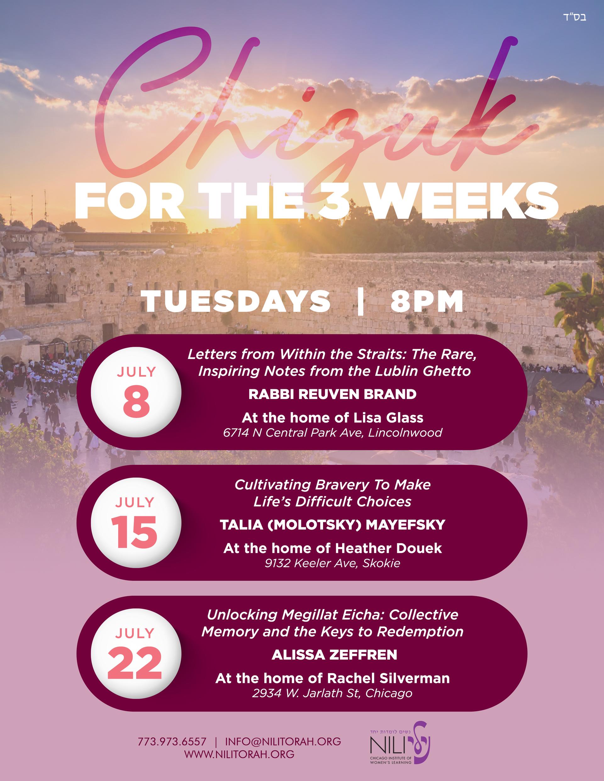 As we journey through the Three Weeks, we invite you to gather for a special series of Tuesday night learning and inspiration, designed to strengthen our hearts and deepen our connection during this meaningful time.