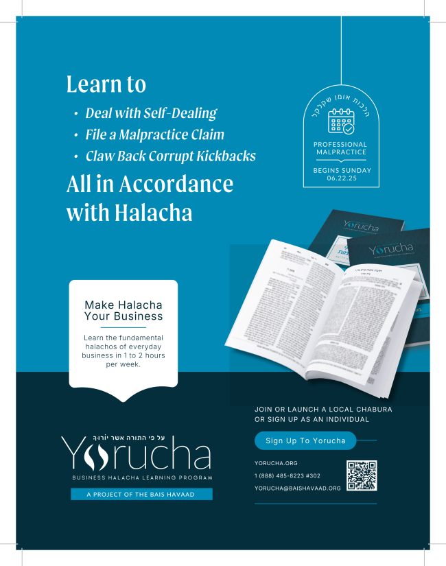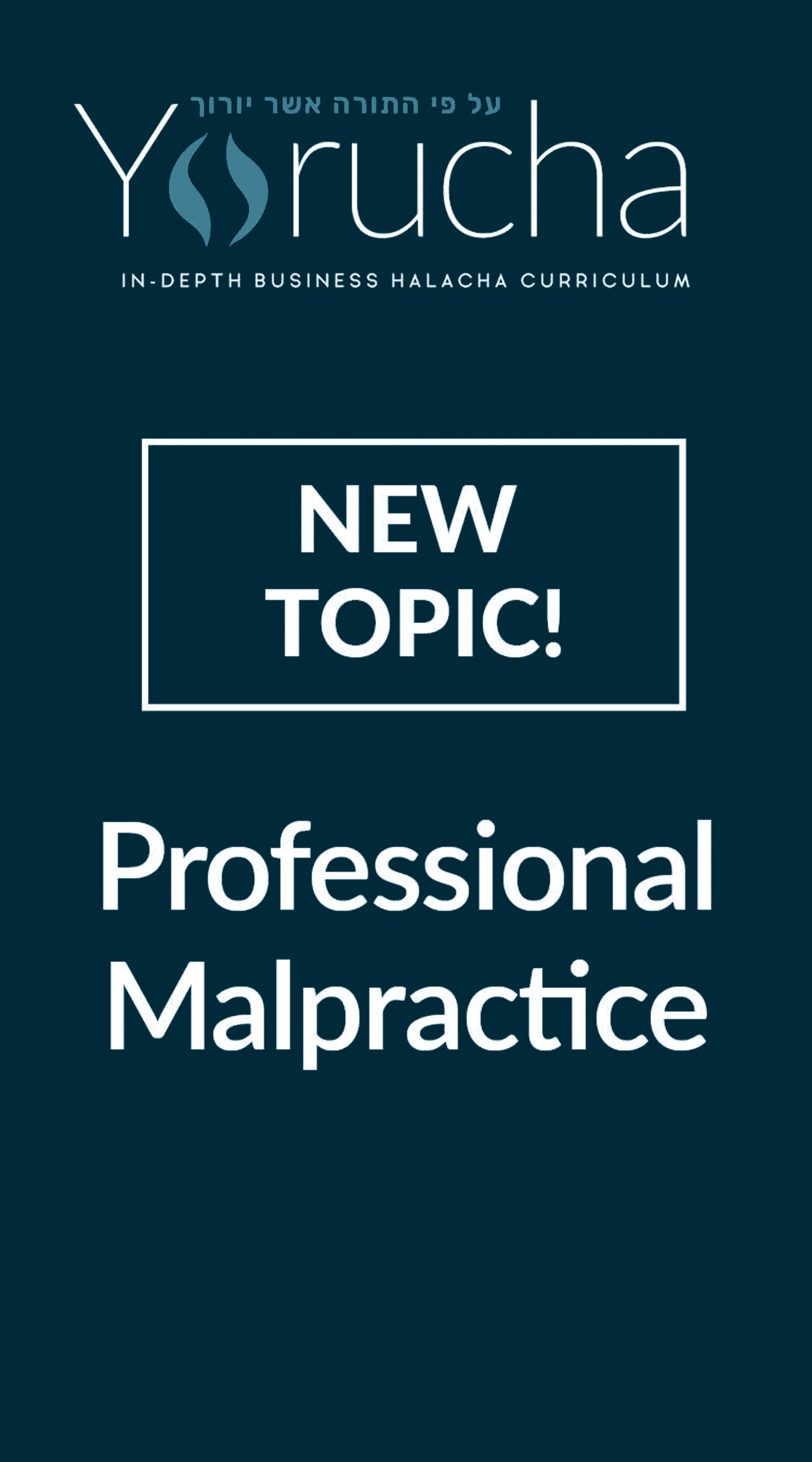 Current Yorucha Topic: Professional Malpractice | | The current Yorucha limud focuses on the halachos of professional and medical malpractice. The sugyos cover the responsibilities and liabilities of paid and unpaid professionals, including doctors, contractors, and financial advisors. Topics addressed include damage from poor performance, liability for detrimental advice, loss of revenue due to negligence, and halachic perspectives on insurance claims.