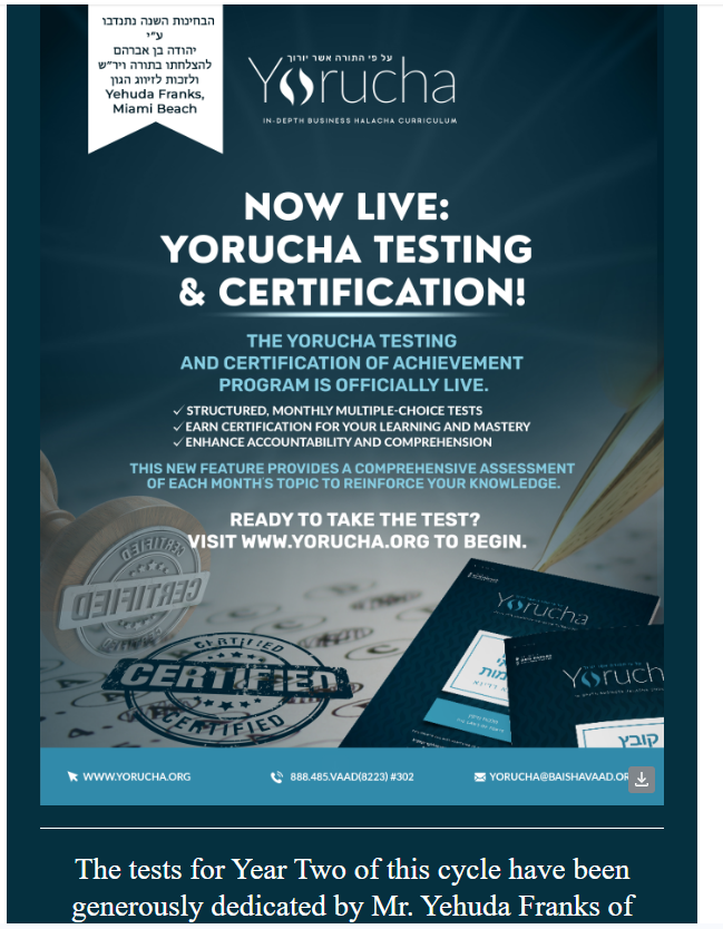 The curriculum explores four primary areas: general malpractice, medical malpractice, liability for potential revenue loss, and corruption/self-dealing. The halachos of arvus (guarantees), minhag hamakom, and dina d'malchusa are applied to determine professional responsibility. The topic concludes with a discussion of bribery, kickbacks, and ethical conduct for public officials and communal decision-makers. | | | Yorucha Testing Continues | Yorucha continues with providing tests on the current curriculum topics. The latest exam, focused on "The Bais Din Process," features 25 questions covering the most recent four-week unit. These assessments help learners review material thoroughly and measure retention. The test is available on the Yorucha online portal at the end of the relevant section. | | | On Monday, May 19th, Rav Baruch Fried, Dayan and editor of the Yorucha curriculum, gave a Zoom shiur to the Yorucha chabura based in Brazil. The chabura has been steadily learning Hilchos Tzedakah u'Maaser. Following the shiur, a live Q&A session with Rav Dovid Grossman and Rav Fried addressed real-life issues, including a meaningful discussion on the high cost of tuition in Brazil and its halachic implications through the lens of tzedakah. | | | New Yorucha Chabura Opens in Marine Park | Khal Tiferes Avrohom Zidichov, under the leadership of the Zidichover Rebbe shlit"a, has launched a Yorucha chabura as part of its learning programs. Located at 4017 Avenue P in Brooklyn, the chabura meets Sunday mornings following Shacharis and began with the first topic in the curriculum: Dina D'malchusa. The addition reflects the kehillah's ongoing growth and commitment to Torah learning. | | | Rabbi Grossman Visits Toronto Chaburos | | Over the extended Parshas Beha'aloscha weekend, Rav Dovid Grossman, Rosh Bais HaVaad, traveled to Toronto, where he visited several of our vibrant Canadian chaburos. Among them were the chabura at Kollel Toronto, under the leadership of Rabbi Goldner and Rabbi Silver, and the chabura at the Bobover Bais Medrash, led by Rabbi Ari Hofstedter and Rabbi Shmuly Kanner.