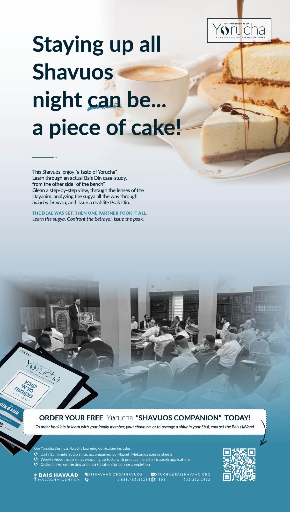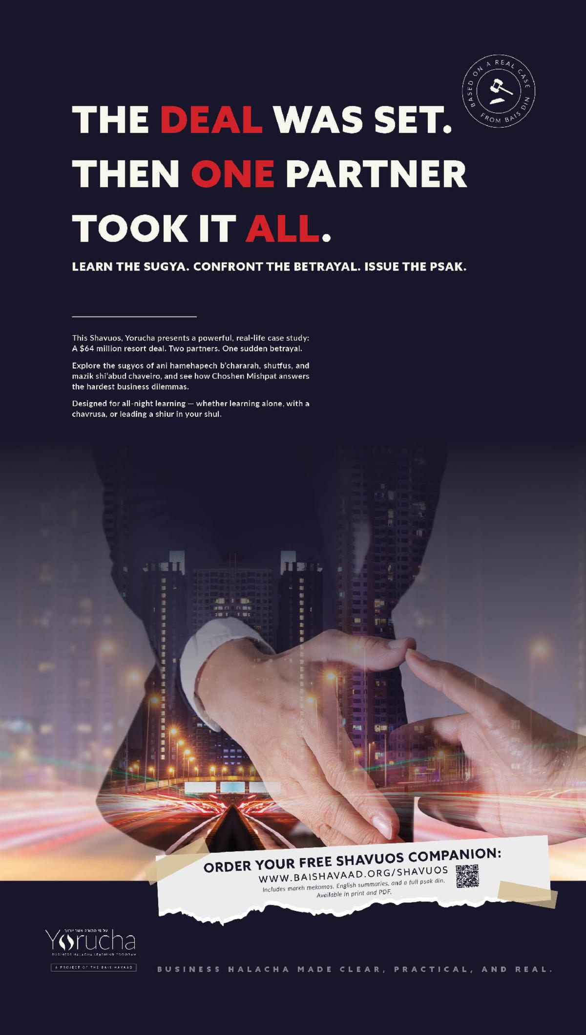 Rav Grossman delivered a shiur on the halachos of mischar bi'Shabbos (commerce on Shabbos), addressing contemporary cases such as online business activity and evolving employment structures. The shiur explored the practical ramifications of these developments within the framework of Hilchos Shabbos. | | | Bais HaVaad Releases Annual Shavuos Companion | | As in recent years, the Bais HaVaad once again published its annual Shavuos Companion, a widely used resource for those who dedicate the Yom Tov night to intensive Torah study. This year's edition presents a particularly intricate and thought-provoking case involving a partnership poised to purchase a multi-million dollar resort—until one of the partners attempts to withdraw and acquire the property independently.