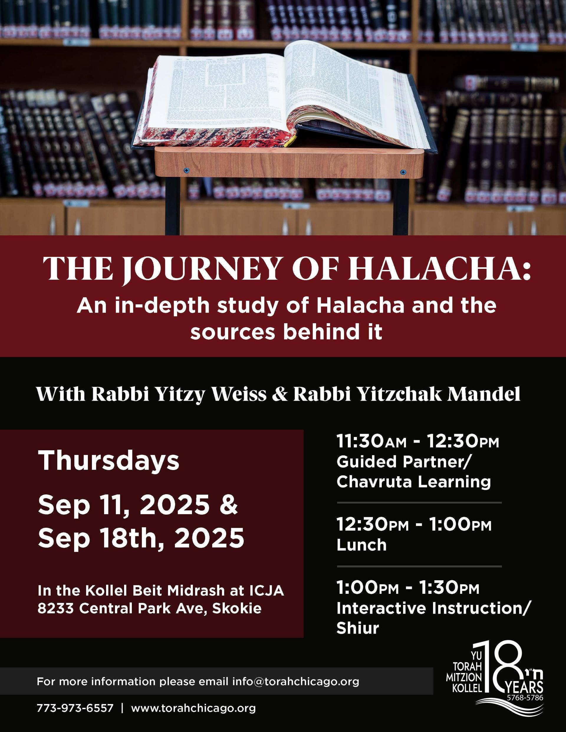 We are excited to invite you to a brand-new shiur, The Journey of Halacha: An In-Depth Study of Halacha and the Sources Behind It, with Rabbi Yitzy Weiss and Rabbi Yitzchak Mandel. Don't miss this engaging opportunity to deepen your understanding of Halacha and its sources.