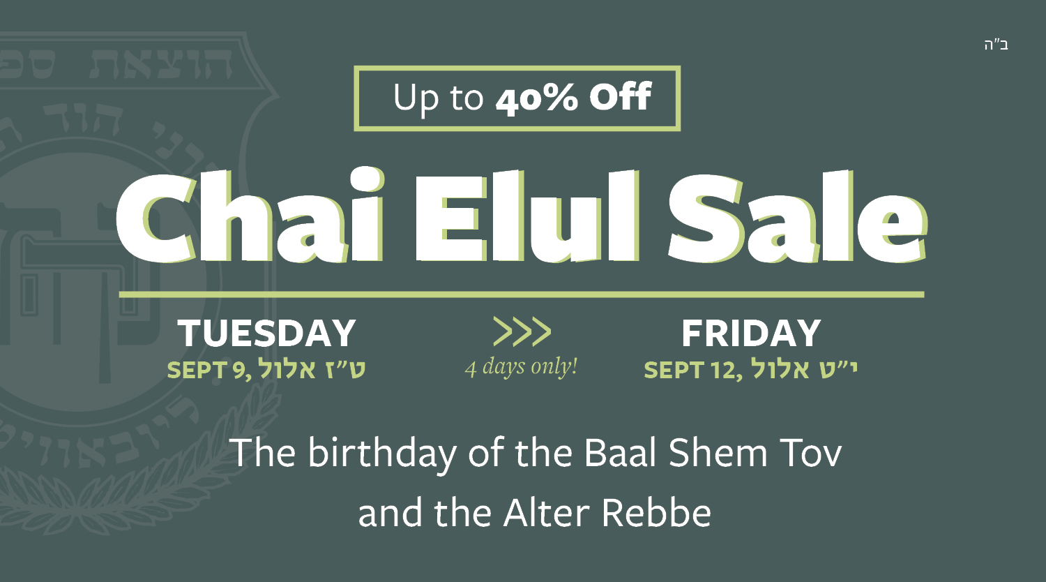 Subject: Annual Chai Elul Sale at Kehot · Up to 40% Off!