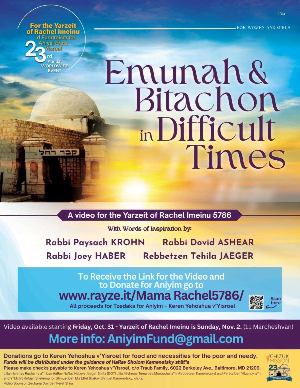 All-new Video for 5786: " EMUNAH AND BITACHON IN DIFFICULT TIMES " -- with short inspiring shiurim from: Rabbi Pesach Krohn, Rabbi Joey Haber, Rabbi Dovid Ashear, Charlie Harary, and Rebbitzen Tehilla Jaeger. (video - 1 hour)