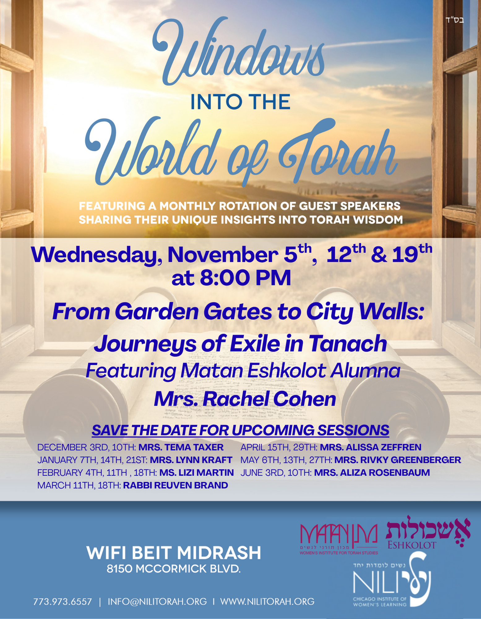 ----- Forwarded Message -----From: "NILI: Chicago Institute of" Women's Learning" <info@nilitorah.org>To: "Chana Chroman" <mates57564@aol.com>Sent: Wed, Nov 5, 2025 at 9:02 AMSubject: Tonight! Join Windows into the World of Torah with Mrs. Rachel Cohen