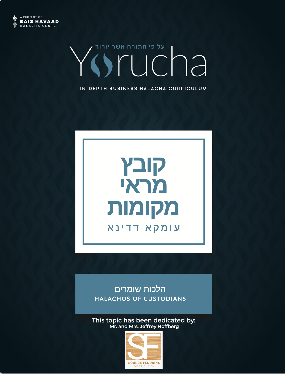 Morning seder is focused on Hilchos Halva'ah and To'en veNit'an, while second seder begins with Hilchos Areiv and Nizkei Shecheinim, and continuing into the third chelek of Choshen Mishpat. | | | Current Yorucha Topic: Custodians -הלכות שומרים | | The current limud in the Yorucha program is Hilchos Shomrim, covering the halachos of custodianship in both personal and business settings.