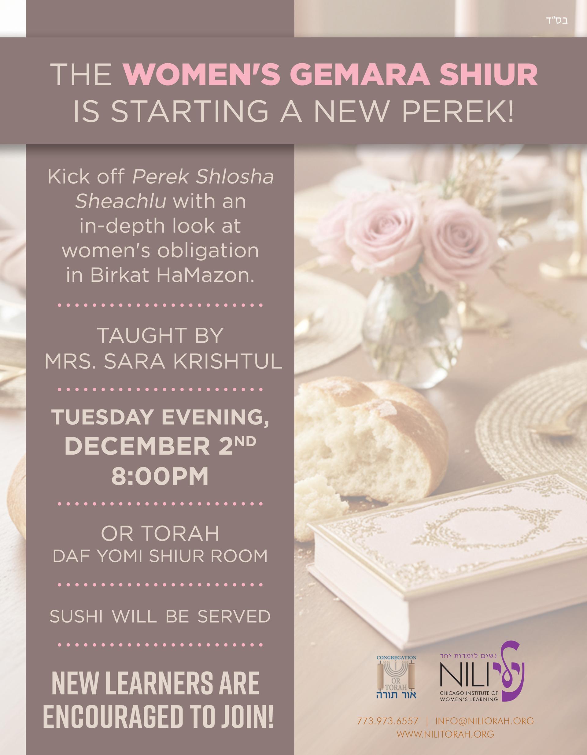 Mrs. Sara Krishtul will be opening Perek Shlosha Sheachlu with an engaging and accessible look at women's obligation in Birkat HaMazon, making it an ideal starting point for anyone who has been curious about Gemara learning but hasn't yet taken the leap.