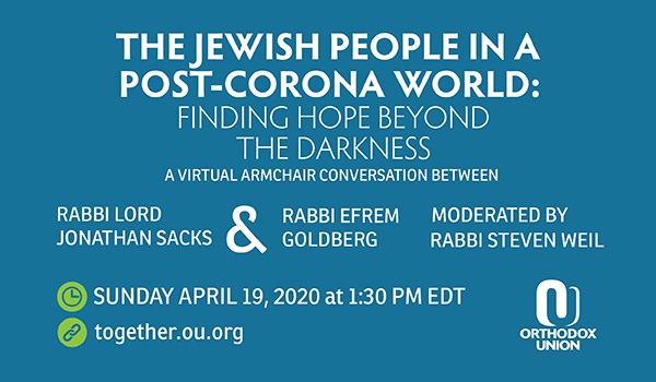 | | presented by the KARASICK DEPARTMENT OF SYNAGOGUE & COMMUNITY SERVICES The Jewish People in a Post-Corona World: Finding Hope Beyond the Darkness Sunday, April 19, 1:30 PM EDT Join Rabbi Lord Jonathan Sacks and Rabbi Efrem Goldberg for a virtual armchair conversation moderated by Rabbi Steven Weil. Watch it here | | Join Us for a Daily Tehillim and Chizuk Call 1 PM EDT - Sunday-Friday - 773-377-9170 or 480-210-2150 Today's featured speaker: Rabbi Joseph Friedman of the DAT Minyan in Denver, Colorado. Thank you to the sponsors of today's call - see a list of sponsors below. To sponsor the Daily Tehillim and Chizuk calls, please visit ou.org/call. The deadline to submit sponsorships for the daily call is 5:00PM EDT of the evening before and for Saturday night's at midnight EDT. To access previous Daily Tehillim and Chizuk Call audio files, please click here. It is valuable to daven (pray) for specific cholim (people whom are sick) by name. There are a number of lists available of those who need our tefillot (prayers). Please click here to access. | View all of today's OU programs presented by the OU Women's Initiative Torat Imecha Nach Yomi Siyum | presented by The OU ImPact Accelerator Ani Tefila @ Home Watch the Series on Demand Ani Tefillah @ HOME is a captivating video series that inspires heartfelt tefillah through a transformative - visual approach. The lessons are based on the Ani Tefillah curriculum. Adults and children alike will be inspired to pray with more kavana forging a deeper and more meaningful connection to G-D. Watch lesson 1 / Watch lesson 2 | presented by OU Torah Initiatives Remembering the Rav Watch on Demand Rabbi Menachem Genack marked the Rav's 27th Yahrzeit, commemorated this past week, with a shiur and memories of when he learned with the Rav. Watch presented by OU-JLIC Don't Just Count the Days- Make the Days Count! Join Rabbi Yonatan Hirschhorn, OU-JLIC Torah Educator at University of Maryland, for a daily Sefirat HaOmer WhatsApp. Get a short vort on the sefira of the day- plus a daily avodah related to that sefira. Join the WhatsApp group | | | presented by KARASICK DEPARTMENT OF SYNAGOGUE & COMMUNITY SERVICES Board and Card Games for Various Ages Suggestions for various games you can get to spend quality family time. Read more Thank you to the generous sponsors of today's 1PM Tehillim/chizuk call: Seymour and Mindy Liebman in the zechus for a refuah sheleima for Shifra bat Miriam. Anonymous in the merit of a refua sheleima for all those afflicted by the Coronavirus, and for the refuah sheleima of Chaya Shira bat Chana. Ronnie and Jennifer Herrmann for a refuah sheleima for all those in need. Helen and Jacob Weichholz, in commemoration of the yahrzeit of our mother Zelda bas Shmuel Weichholz. David and Tsila Sloane, in honor of their daughter, Talya Emunah Zamira's 8th birthday today! | | | | |