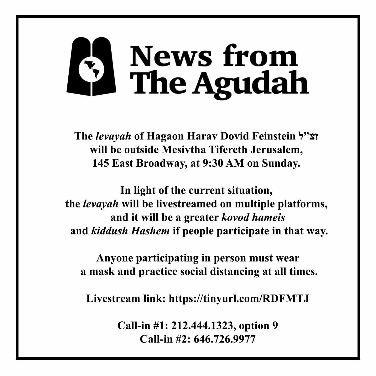Subject: Harav Dovid Feinstein ZT"L Levayah Information