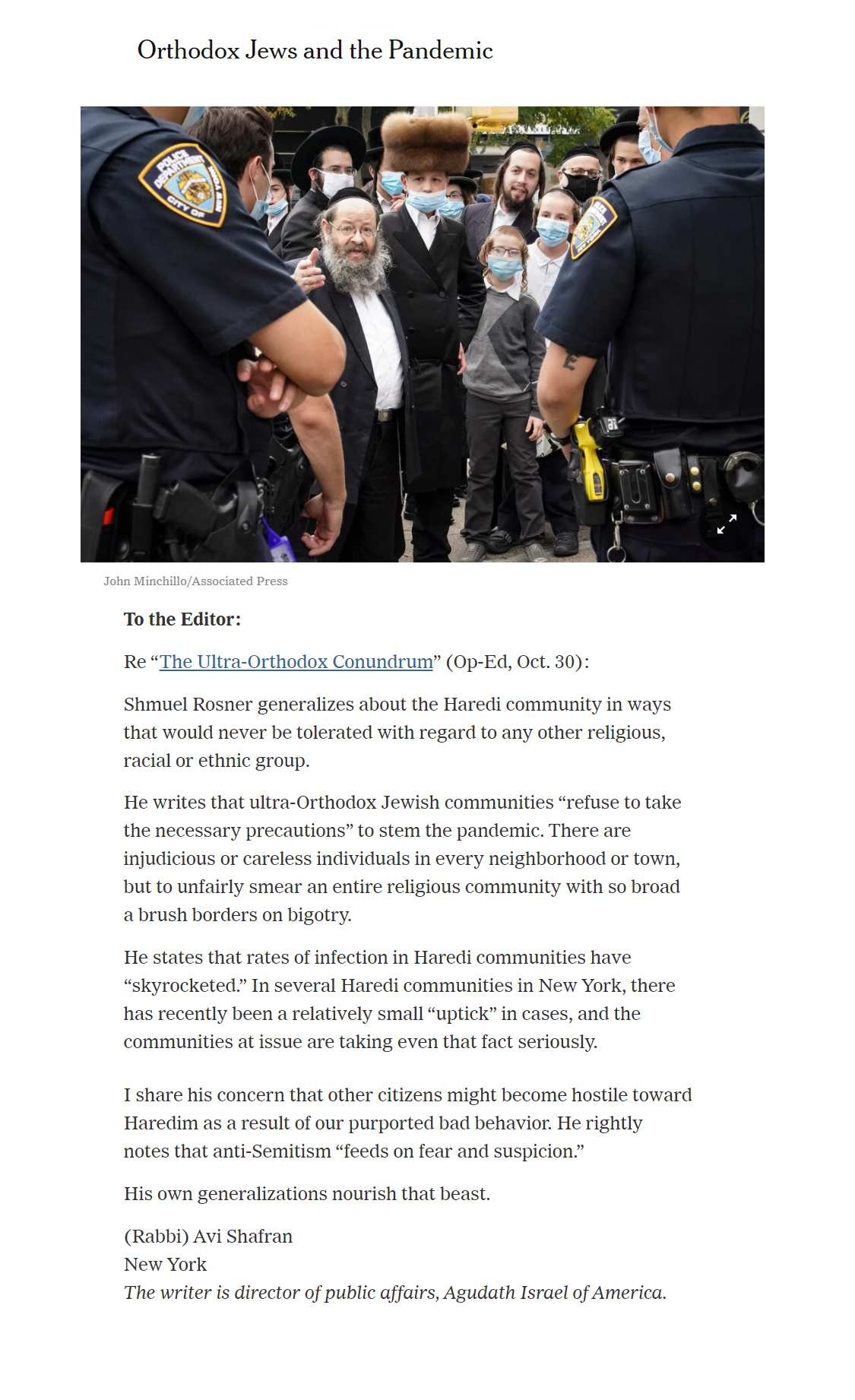 - Rabbi Shafran responded to an offensive Op-Ed in the New York Times. See below to read Rabbi Shafran's response.