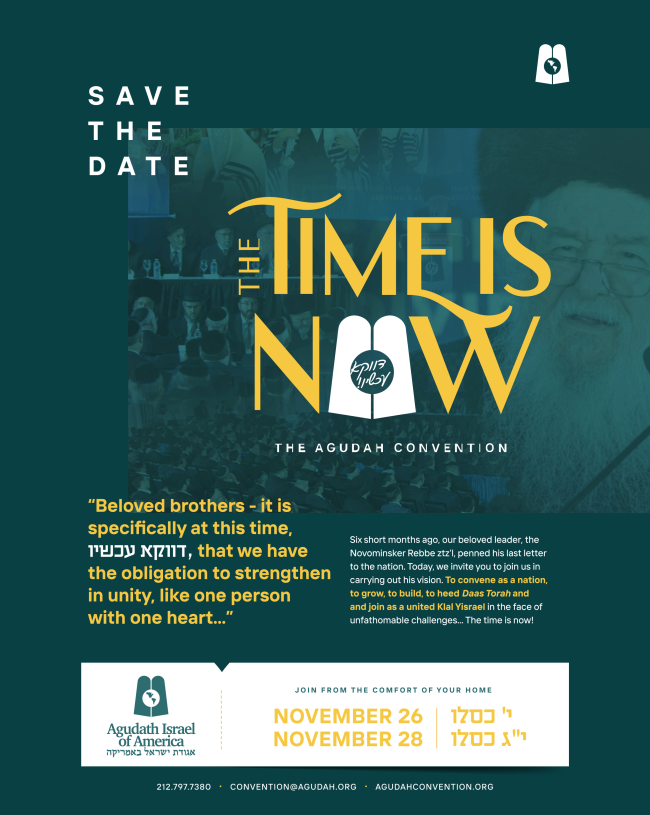 Agudath Israel also looks forward to working with the Governor's office to balance keeping Orthodox Jewish communities safe while respecting and protecting all freedoms, and especially religious freedoms, a freedom Agudath Israel will never waver defending. | | SAVE THE DATE: Agudah Convention 2020 | | Save the date! We are excited to announce that you will be able to attend this year's Agudah Convention from the comfort of your own home on the evenings of November 26 and November 28. Six short months ago, our beloved leader, the Novominsker Rebbe ztz'l, penned his last letter to the nation. Today, we invite you to join us in carrying out his vision. To convene as a nation, to grow, to build, to heed Daas Torah and join as a united Klal Yisroel in the face of unfathomable challenges... The time is now!