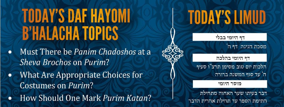 | | PLEASE NOTE: The information in this email is for learning purposes only. Please review the Mishna Berura and Biurim U'Musafim before making a halachic decision. Hebrew words are occasionally transliterated to enable a smoother reading of the text. Common Ashkenazi pronunciation is generally used in these cases. | | | | Daf Hayomi B'Halacha Shiur Rav Asher Eisenberger | Synopsis of Today's Halachos Rabbi Yerachmiel Garfield | | | | Daf Hayomi B'Halacha Shiur - Yesterday's Limud - Rav Daniel Glatstein | | Daily Kinyan Chochma Shiur Rav Zev Smith | | | | | | |