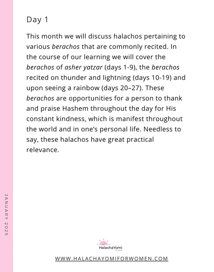 Good morning and welcome to another month of Halacha Yomi for Women! This month we will be learning about everyday brachos. We are excited to get started! Make sure to be on the lookout for the full PDF coming soon....