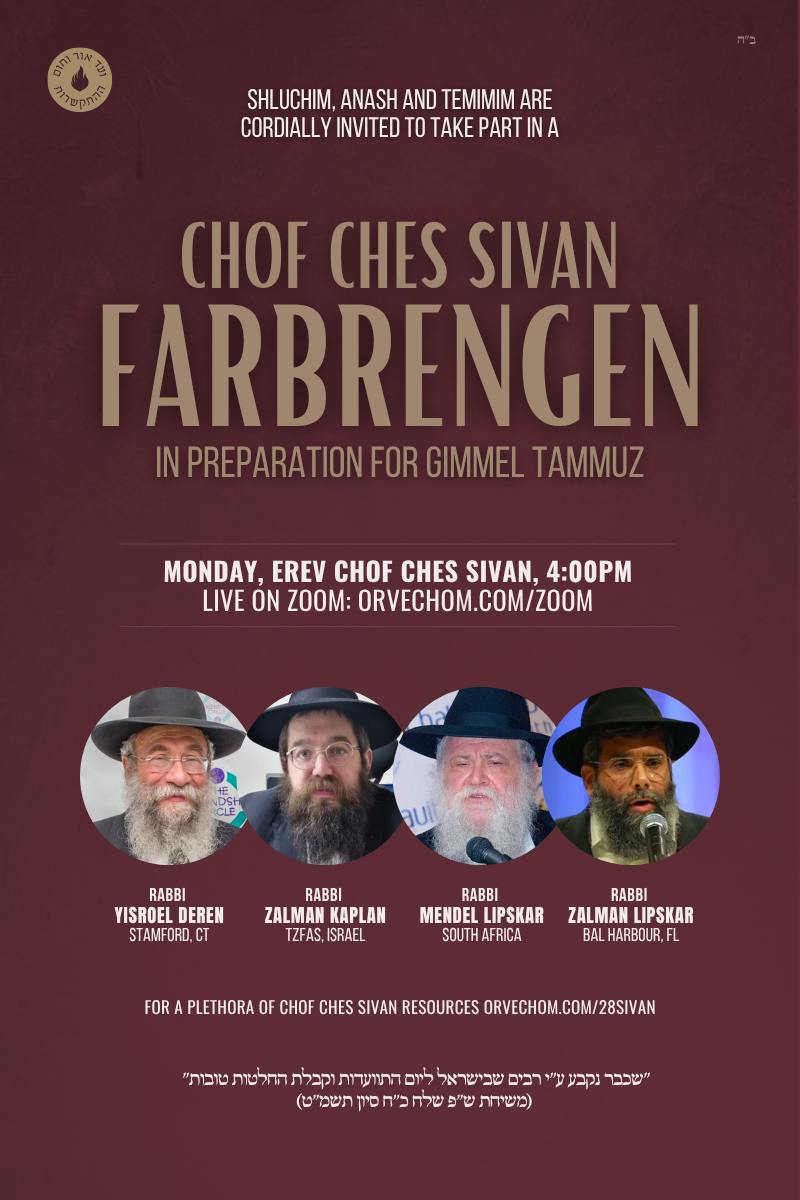 The Farbrengen will take place on Monday, Erev Chof Ches Sivan, at 4:00 PM ET, and will feature words of inspiration from Rabbi Yisroel Deren – Stamford, CT, Rabbi Zalman Kaplan – Tzfas, Israel, Rabbi Mendel Lipskar – Johannesburg, South Africa, Rabbi Zalman Lipskar – Bal Harbour, FL, and others.